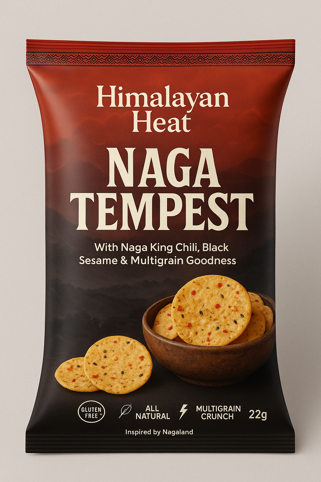 Naga Tempest blends 7 nutrient-rich grains with Nagaland’s iconic smoked chilly and smoky barbeque for a bold, fiery snack.”